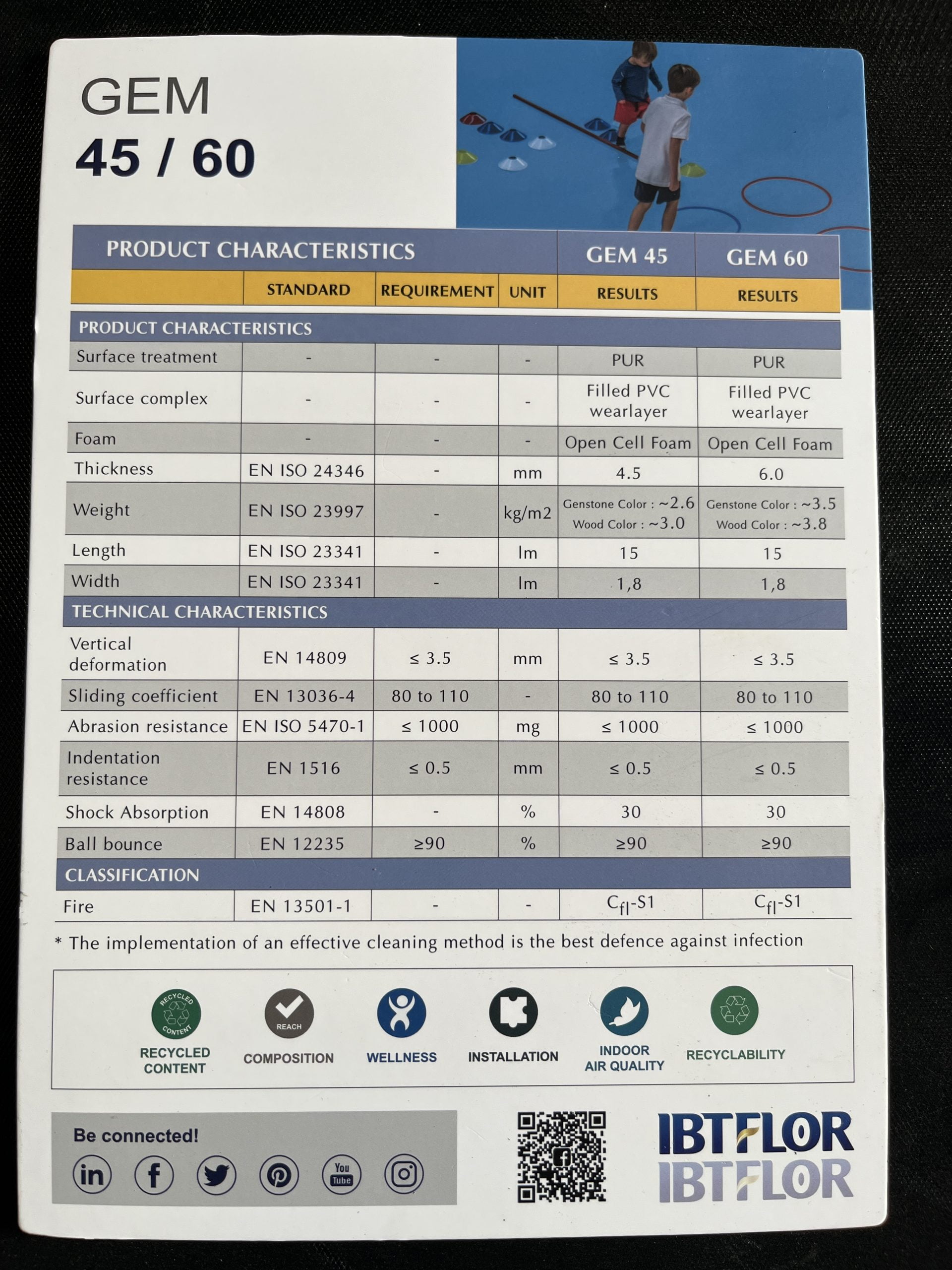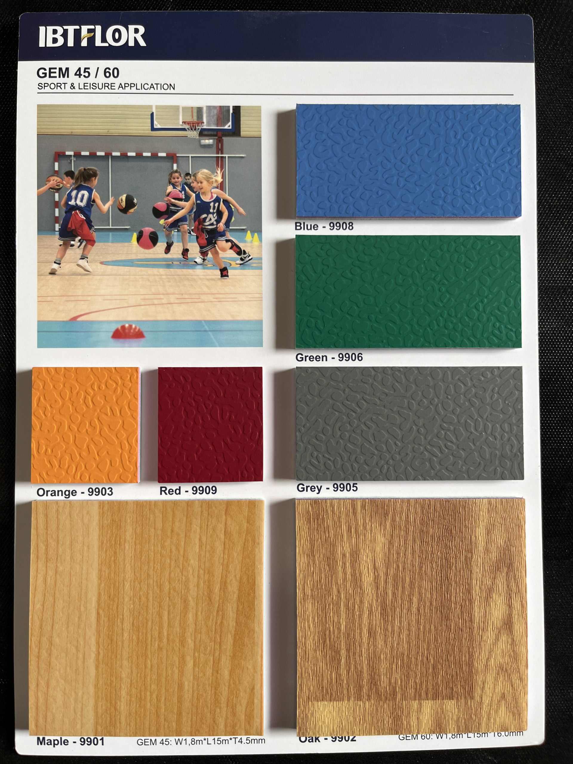 - Chất liệu chuyên dụng: Sàn vinyl IBTFLOR GEM được thiết kế đặc biệt cho sân thể thao, với chất liệu chống trơn và chịu lực tốt, tạo điều kiện an toàn và thuận lợi cho hoạt động thể thao.